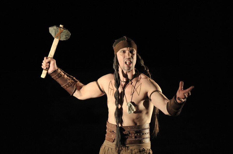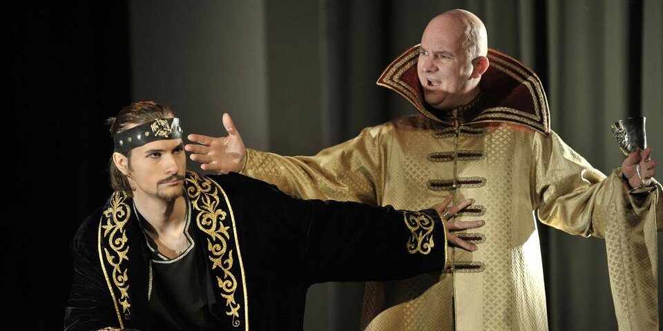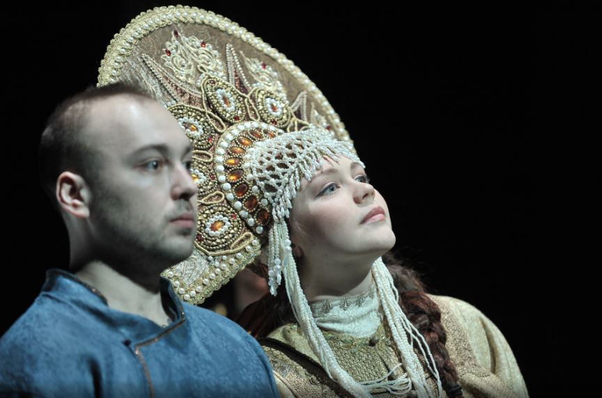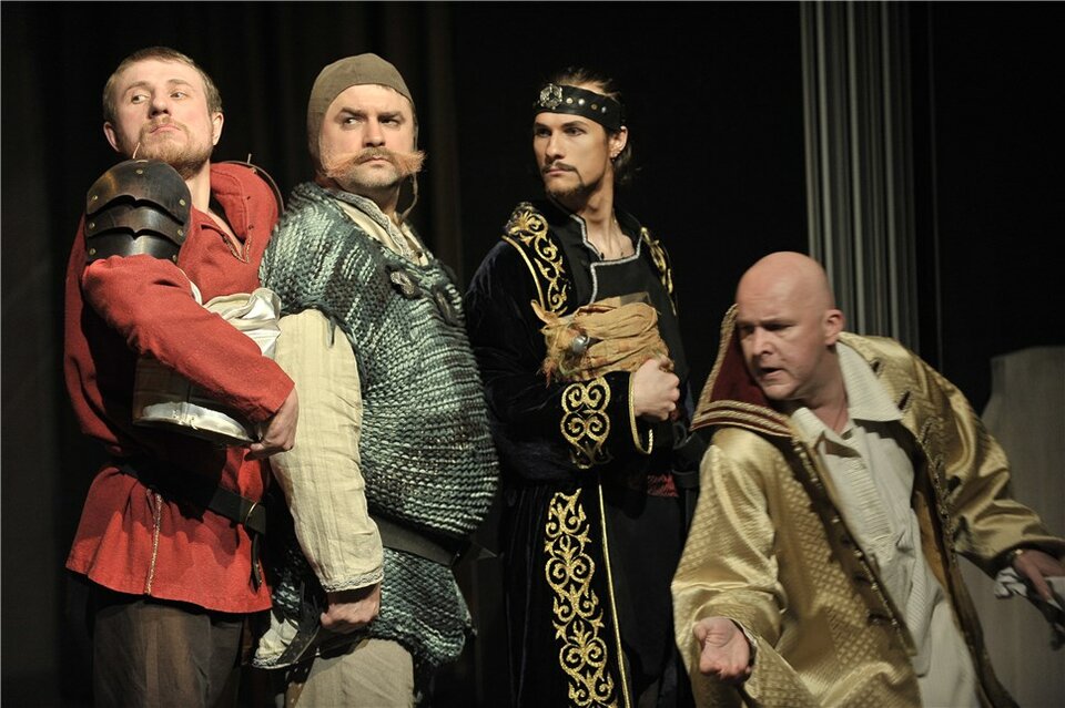 Эта работа — своеобразный «поклон» Петру Наумовичу: ведь на сцене его любимый Пушкин, разобранный очень подробно, с любовью и большой иронией. Да и сценическое пространство, в котором разыгрывается поэма — зрительское фойе Новой сцены — своего рода «цитата»: там же идет спектакль Петра Наумовича Фоменко «Триптих» по А. С. Пушкину. Михаил Крылов работает с пушкинским текстом в немного детской форме, где игра есть средство постижения мира. Эти мир «понарошку», мир накладных бород и нестрашных чудищ. Здесь метла становится богатырским конем, а ведро — рыцарским шлемом. Здесь всё условность, импровизация, хулиганство. Здесь много смеха — в первую очередь, над самими собой.