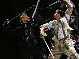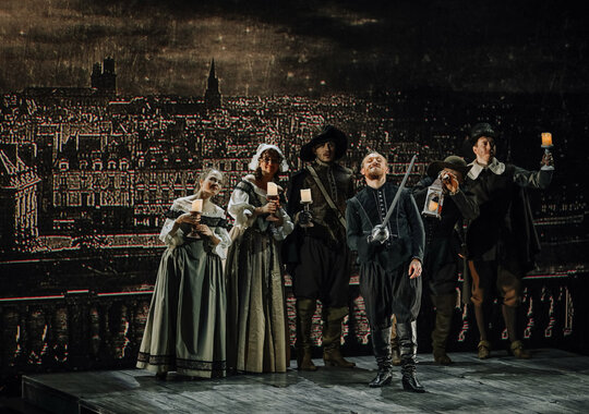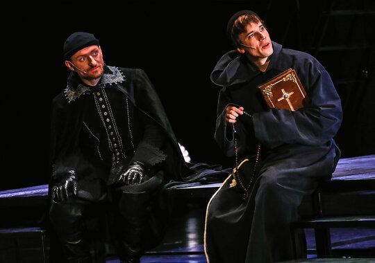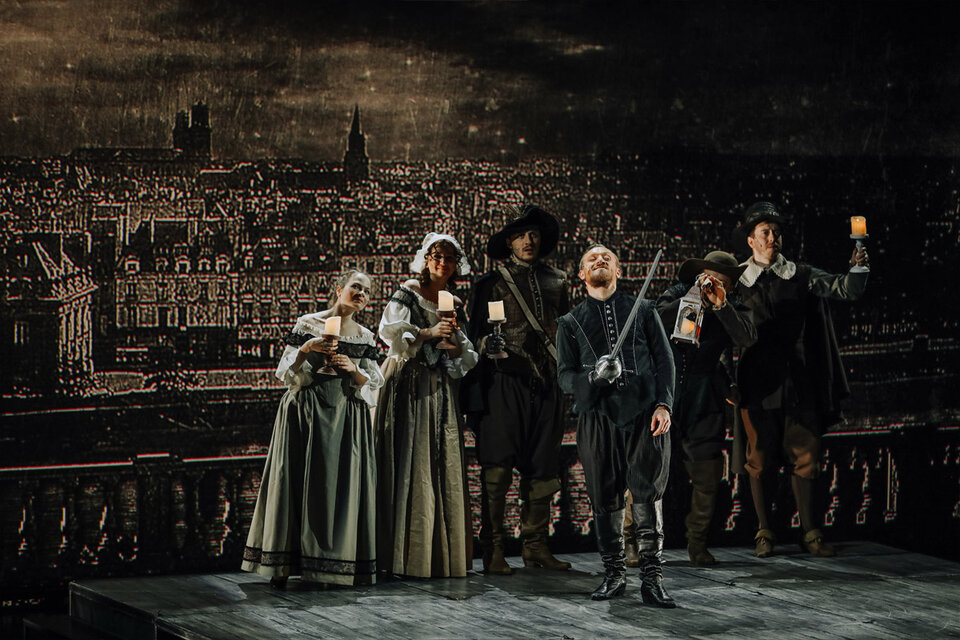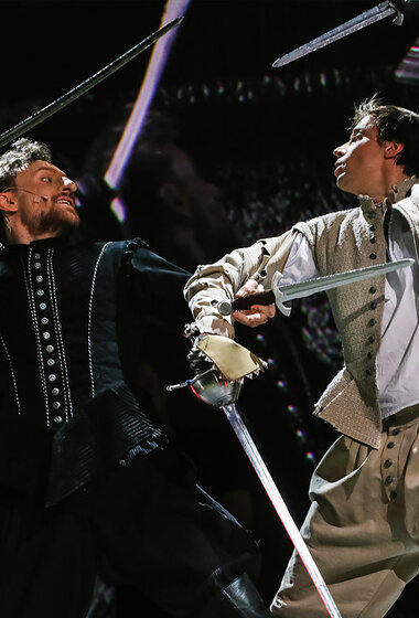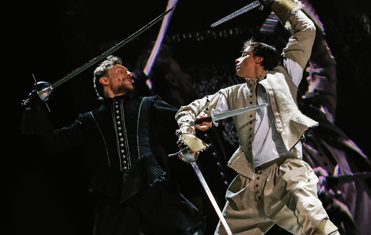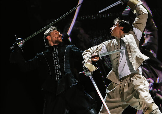 Спектакль «Сирано де Бержерак» посвящен 150-летию со дня рождения и 100-летию памяти французского драматурга Эдмона Ростана, а также 400-летию со дня рождения прототипа одной из лучших пьес Ростана — французского поэта, драматурга, философа, писателя, предшественника жанра научной фантастики Сирано де Бержерака. Для воплощения сценического замысла постановщики используют перекрестие приёмов киносъёмочного процесса и театрального действа как синтез исторической парадигмы и современности. Поэтому главным сценическим приёмом и решением является некая «съёмка фильма» по героической комедии «Сирано де Бержерак». Яркий, насыщенный позитивом спектакль о героической судьбе художника, сочетающий лучшие черты классической поэзии и живописные приёмы с современной технологической подачей, объединение традиционного искусства и современной актуальной формы, пластичного звучания поэтического текста и насыщенности визуального действия благодаря использованию кинотехнологий. Сценография спектакля сочетает мягкие декорации и использование экранов, что позволяет передать живописность происходящего. Элементы условности подчёркивают, что действие на самом деле разворачивается в кинопавильоне. В постановке участвуют профессиональные операторы, которые в режиме реального времени снимают на камеры происходящее на сцене, активно используют крупные планы актёров, что несомненно усиливает драматический эффект присутствия в сцене. Данный приём объединяет яркие исторические сцены и костюмы с современностью, театральную игру с достоверностью. Использование видеокамеры и онлайн-трансляции, выведенной на экраны вместе со специальными кинофонами и пейзажами, стало оформлением спектакля.