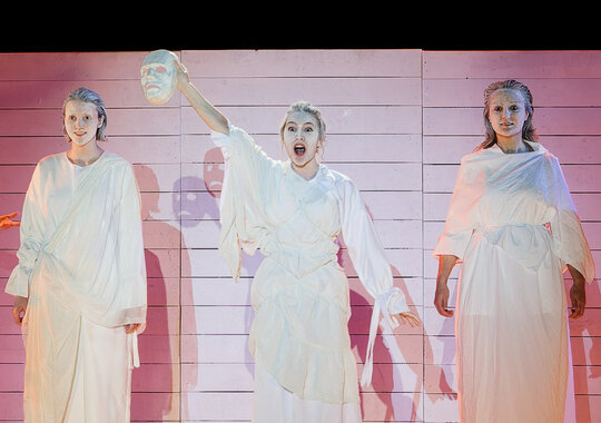 Это история о возвращении бога Диониса в родные Фивы, о мести царя Пенфея, который не признает его божественную сущность. В постановке Юрия Муравицкого древнегреческая трагедия обретает новое звучание. Дионис — бог вина, безумства и экстаза — сводит с ума женщин Фив, и они, словно по мановению волшебной палочки, превращаются в вакханок, отправляясь на гору Киферон, чтобы отдаться безумной и неистовой радости. Это первый спектакль актерского курса ММУ, и первый случай, когда студенческий спектакль еще до премьеры был показан на фестивальных площадках. Студенты прошли стресс-тест на главной сцене Московского фестиваля «Театральный бульвар», представив спектакль в формате эскиза, а до этого на открытых репетициях, в течение недели, вместе со своим мастером. В середине октября специальный показ спектакля «Вакханки» стал лучшим событием программы театр на фестивале «Каро. АРТ» в кинотеатре «Октябрь». «Вакханки» — это столкновение инстинкта и логики, бурлящая энергия древнегреческого театра, дионисийское буйство и пронзительная трагедия о человеческих страстях, которые могут привести к ужасающим последствиям. Спектакль «Вакханки» — это возможность заглянуть в глубины человеческой души, где смыкаются реальность и миф, где рождается истинная драма. В спектакле задействованы студенты 3-го курса актерского направления Московского международного университета и студенты 3-го курса театральной режиссерско-актерской лаборатории Московской школы нового кино. Мастера курсов Ю. В. Муравицкий и С. В. Михалищева. Продолжительность: 1 час 45 минут без антракта.