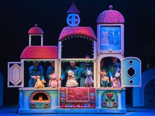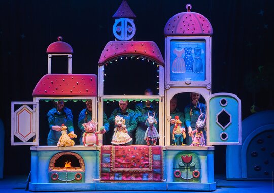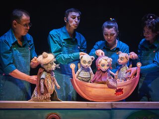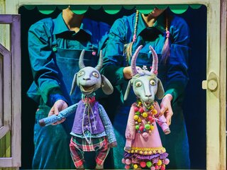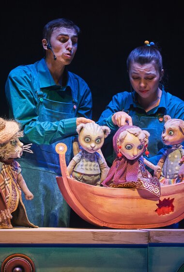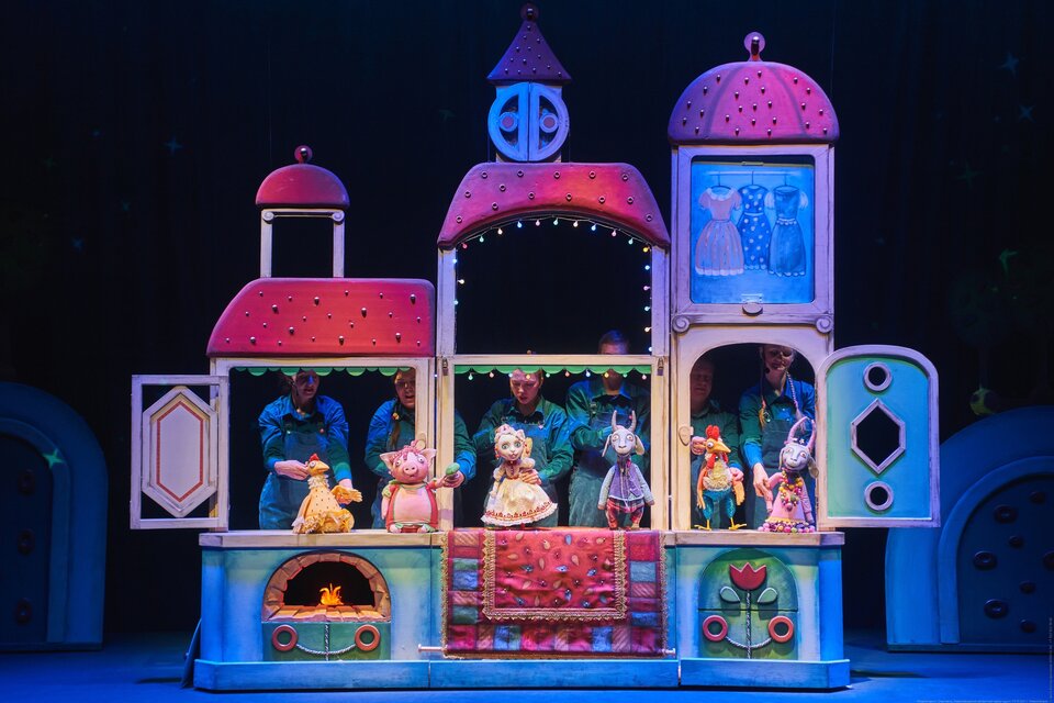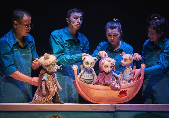 Зрителей ждут удивительно красивые декорации художника Ольги Смагиной, где каждый дом в кукольном городке, где живут Козел, Свинья, Курица и сама Кошка, придуман как забавная механическая игрушка.