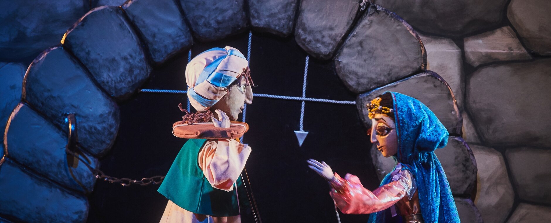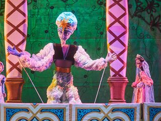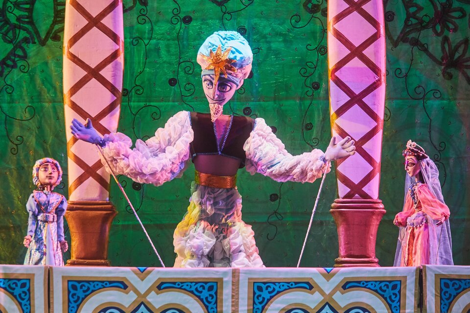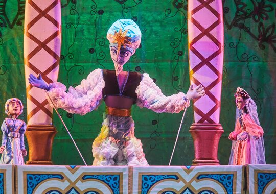 Спектакль поставлен по пьесе известного драматурга Нины Гернет, написанной по мотивам арабских сказок из сборника «Тысяча и одна ночь». Восточная сказка в двух действиях рассказывает о том, как один Султан, который считал себя наимудрейшим, возмечтал выдать свою дочь Будур за Визиря. Он не стал ждать благословения от ночных светил и назначил дату свадьбы. Но судьба вмешалась в его планы: на шумном восточном базаре Будур увидела Аладдина и ... влюбилась. Султан разгневался, Аладдин был сослан в пустыню на погибель, но случай послал ему старую лампу, в которой много веков томился всемогущий Джинн. Действие спектакля разворачивается на фоне красочных декораций. Здесь и восточный город с золотым дворцом, и таинственная пещера с сокровищами, и сказочное звёздное небо! Зрителей ждет волшебство чудесных превращений и потрясающие видеоэффекты! Действие в спектакле разыгрывают изящные тростевые куклы.