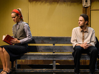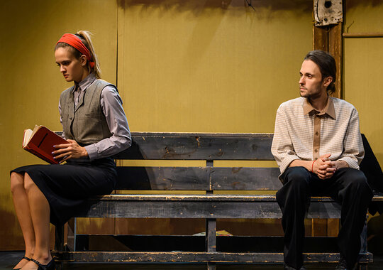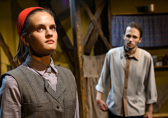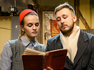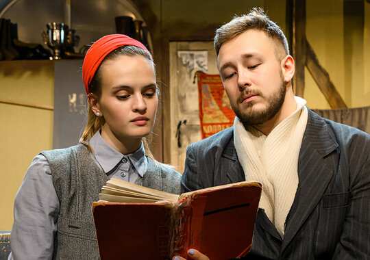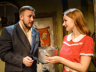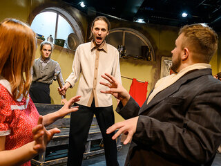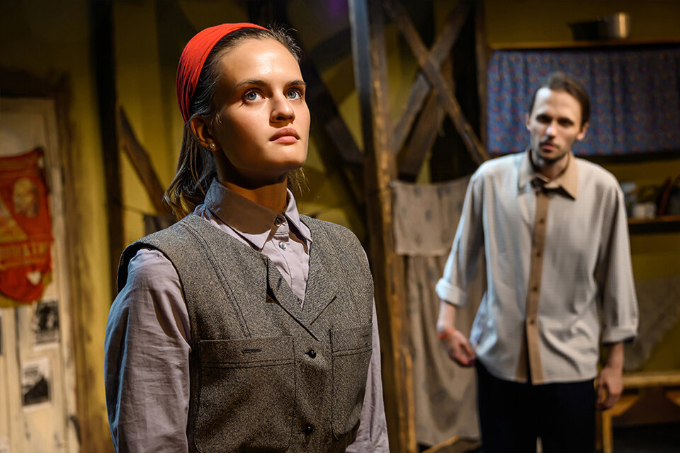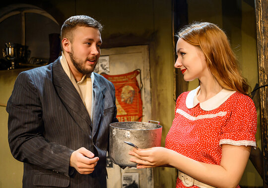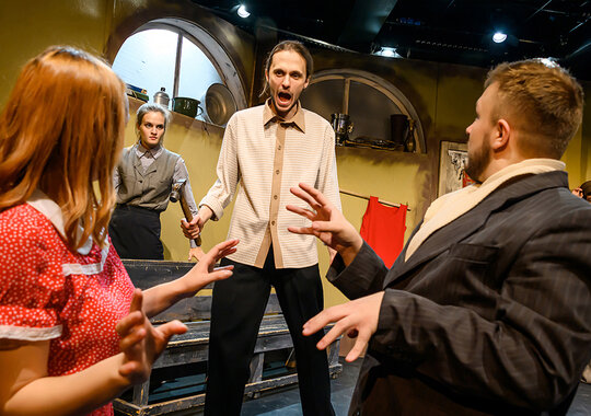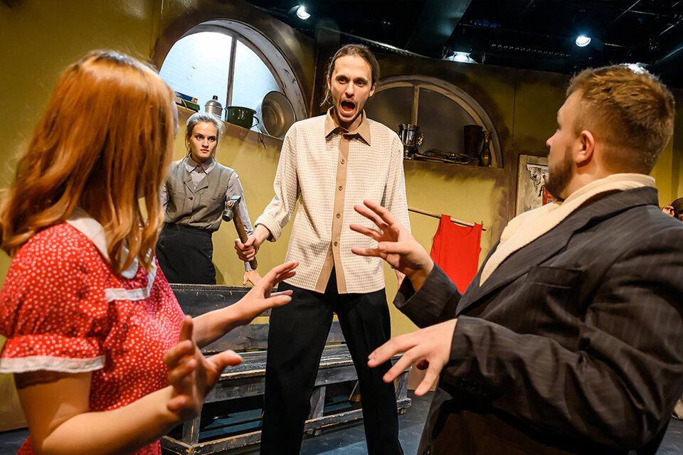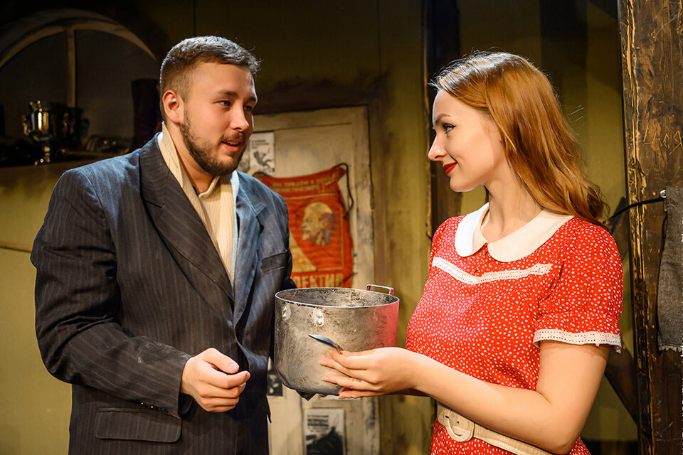 Актёры обживают пространство, превращая зрителей в любопытных соседей, наблюдающих за жизнью шумной молодёжи через щели в картонной перегородке между комнатами. Так и получается: одни гости постоянно заходят в дверь и устраивают шумные построения с песнями, а другие – сидят в зале и, кажется, тоже могут в любой момент присоединиться.