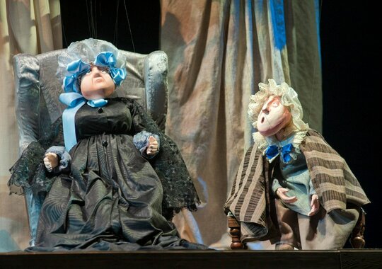 В постановке два плана: план кукол и план актеров, и оба открыто явлены публике. Главная виновница всех бед — старая барыня — тоже кукла. При этом в мире марионеток сама она остается практически обездвиженной. Для режиссера-постановщика Дмитрия Вихрецкого старуха олицетворяет собой образ «деспота в рукавичках», в то время как глухонемой дворник Герасим — герой, который обрывает нити решительно, но болезненно — ценой жизни преданного ему существа.