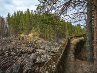 Дальше наш путь лежит к вулкану Гирвас — уникальному по своей красоте природному объекту. Он жил более полутора миллиардов лет назад. Здесь и застывшая лава, и горные породы, и песчаные дюны, и густые сосновые боры. Если повезет, вы попадете на спуск воды из водохранилища и увидите потрясающее зрелище — водопад Гирвас.