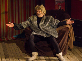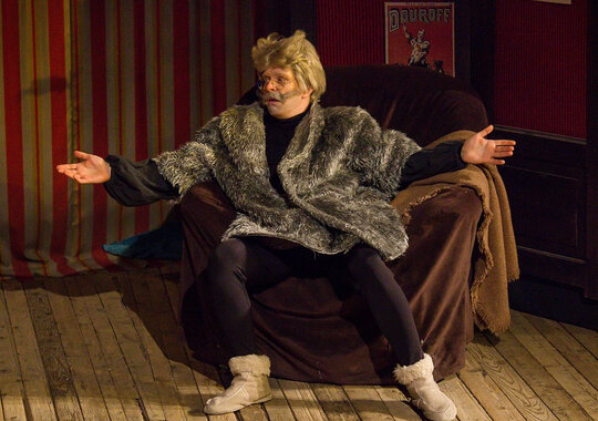 Спектакль ставится на экспериментальной сцене. Жанр постановки заявлен как собачья история.