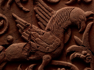 Роскошные геральдические звери: грифоны, львы, единороги, орлы — раннего периода сменились изысканными полихромными ковровыми узорами, а в переплетениях пышных побегов разместились птицы, гербовые изразцы раннего петровского времени заменили кобальтовые сине-белые сюжетные — в подражание голландскому искусству.