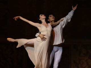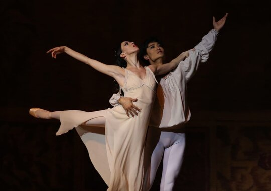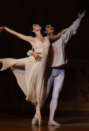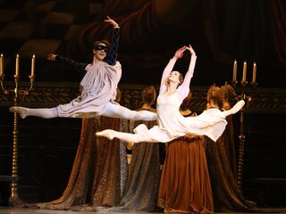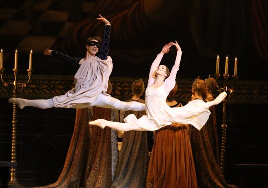 Картина четвёртая. Бал в доме Капулетти. За чопорным танцем с подушками следует чарующий танец прекрасной Джульетты. В зал входят Ромео и его друзья. Ромео поражен красотой Джульетты.