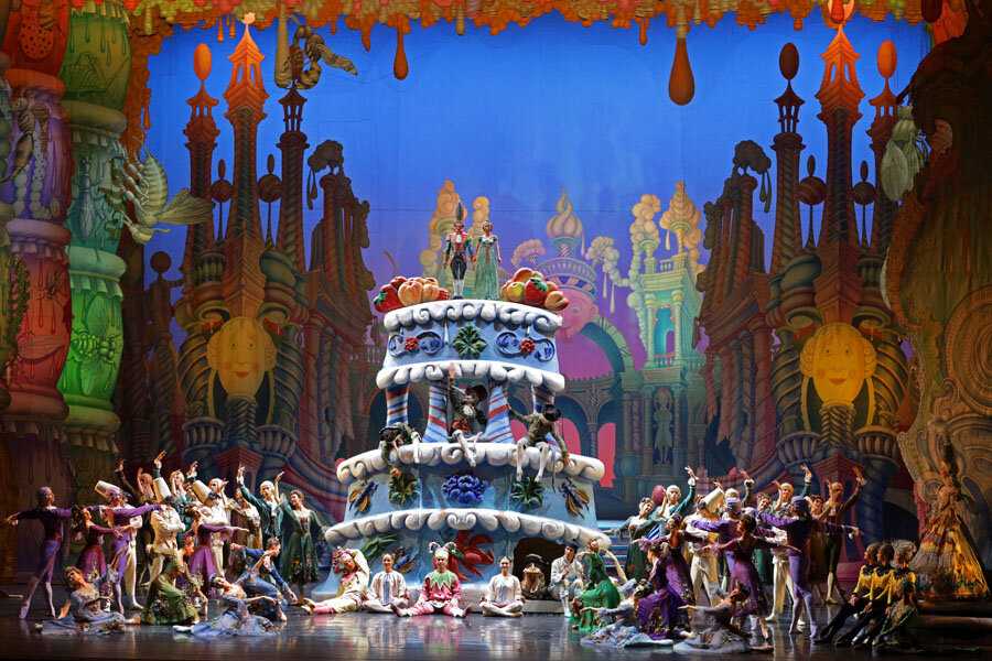 Сцена первая. Лавка сластей «Конфитюренбург». В дедушкином башмаке Маша и Щелкунчик прилетают в Конфитюренбург. Этот дивный сказочный город Щелкунчик показывает своей спасительнице Маше.