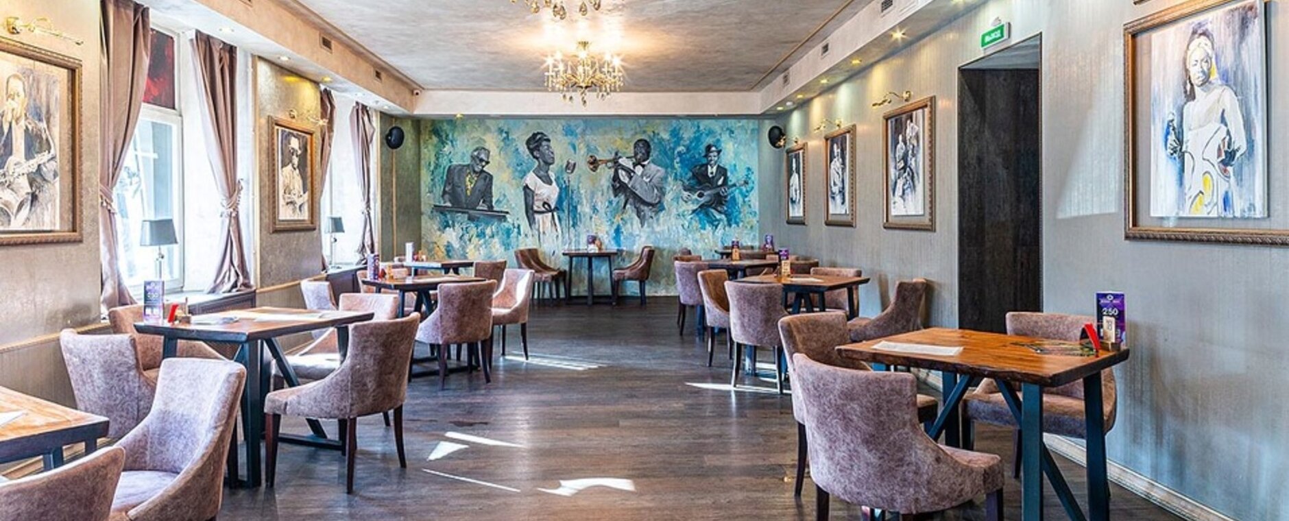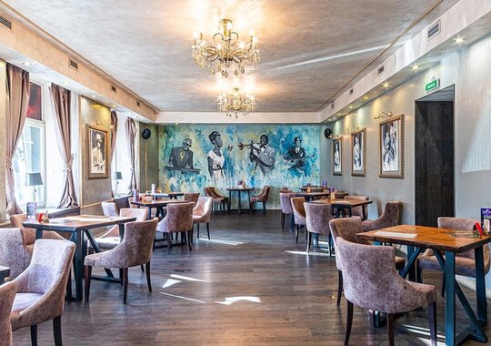 Ресторан располагает двумя залами. Обращаем ваше внимание на то, что сцена находится в первом зале. Второй зал отделён от первого перегородкой, в нём идёт трансляция на видеоэкраны.