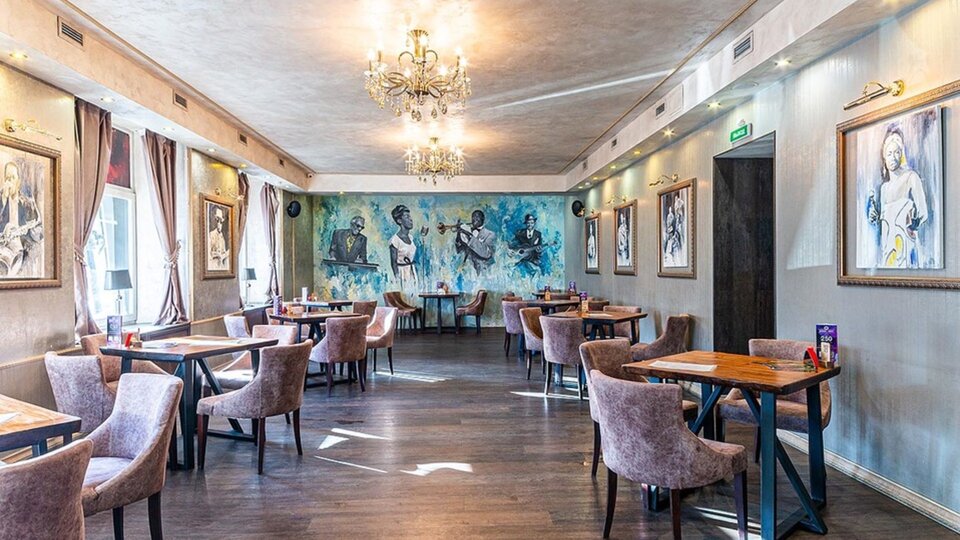 Ресторан располагает двумя залами. Обращаем ваше внимание на то, что сцена находится в первом зале. Второй зал отделён от первого перегородкой, в нём идёт трансляция на видеоэкраны.