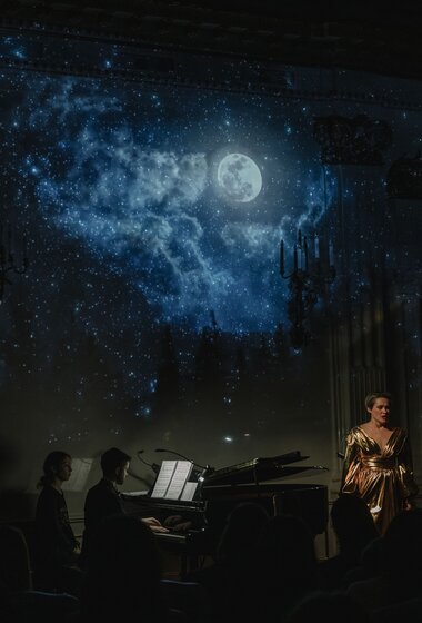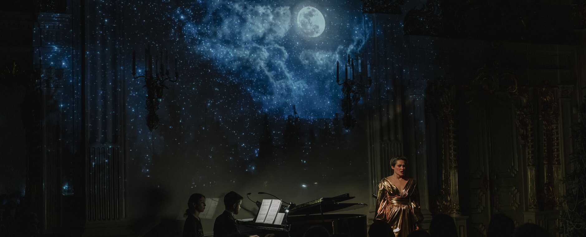 Праздничный концерт пройдёт в новогодних декорациях. Благодаря камерности пространства живая фортепианная музыка и вокал будут звучать на расстоянии вытянутой руки, а эффект погружения в музыку дополнят проекции зимы, ночи и звёздного неба на стены и потолок.