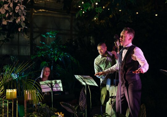 Среди тропических растений и в сиянии множества свечей вы услышите настоящие жемчужины джазовой музыки в исполнении высококлассного джаз-бэнда Jazz Hooligans. А «джаз на луне» окажется не просто метафорой, а изюминкой вечера. Музыкант Дмитрий Гурович сыграет для вас импровизации на инструменте под названием Луна.
