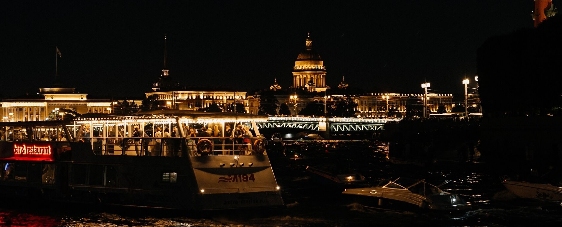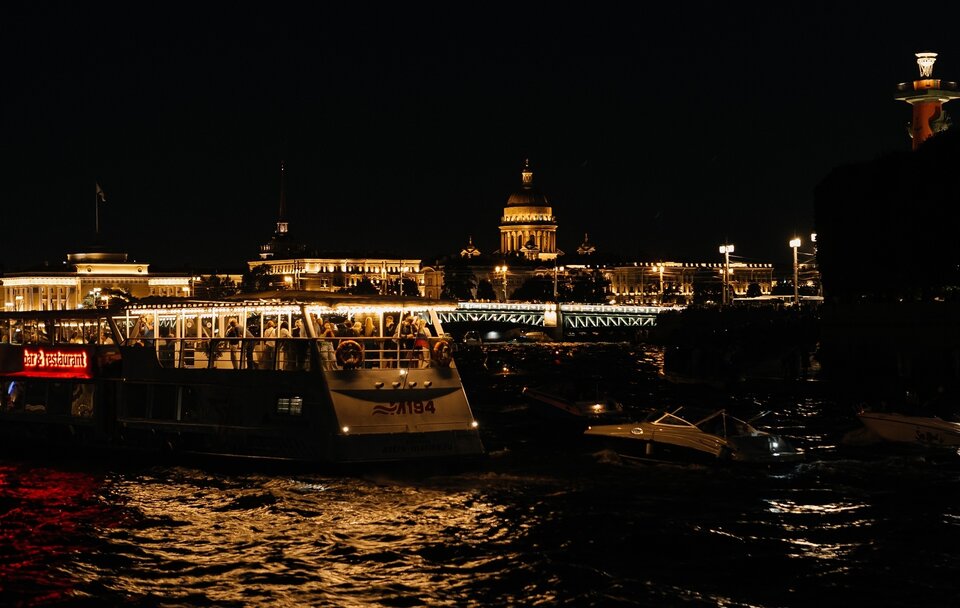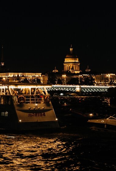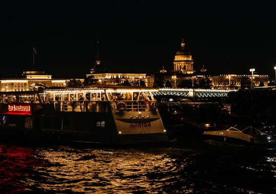 Наш теплоход пришвартован у «Газпром-Арены» и превратился в уютный плавучий клуб, где проходят живые концерты и атмосферные вечера, гарантируя вам тепло и уникальную локацию. Уютная атмосфера, живая музыка, тёплое общение и шикарные виды вечернего города — самый запоминающийся способ провести время.