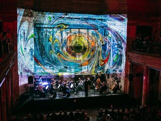 Прямо на ваших глазах художник Ольга Каурова под аккомпанемент оркестра будет создавать живые и красочные картины на воде, проекции которых будут транслироваться прямо на опалённые пожаром стены старинного зала, увлекая в мир прекрасного.