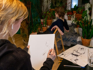 Каждое воскресенье мы устраиваем рисование набросков с людей. Натурщики располагаются в красивом месте галереи, а рисовальщики свободно размещаются вокруг. Каждый раз натурщики разные и в разных образах. Гостям предложено использовать для рисования карандаши, ручки, маркеры, уголь и тушь, новую и винтажную бумагу, географические карты, крафт и листы с текстами.