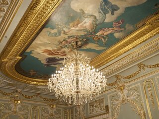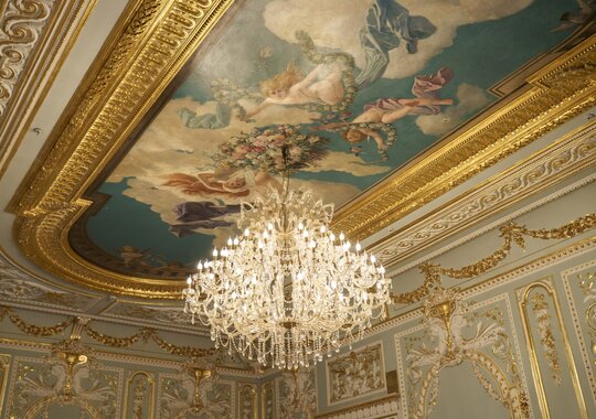 Голубой зал с искусно расписным плафоном, создающим ощущение небесной лёгкости.