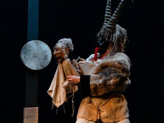 Традиционный площадной театр позволяет рассказать историю разочаровавшегося в богословии ученого, ищущего наслаждений, власти и богатства, через шутовство. Фауст предстает практически Ванькой-дурачком. Сцены разложения души Фауста создаются на наших глазах из подручных средств уличного театра — это и куклы, и маски, и шкуры, и аутентичные предметы русских скоморохов. Сопровождается история народными частушками, скоморошьими присказками, танцами с бубном и общением с публикой.