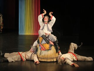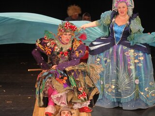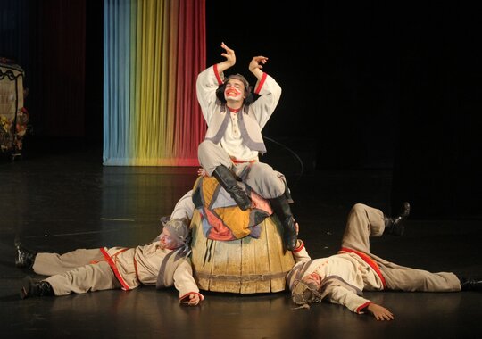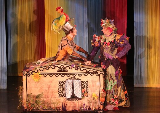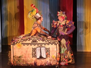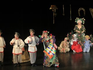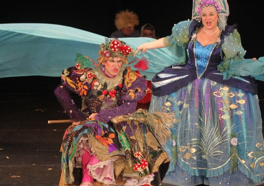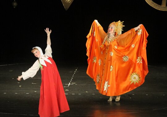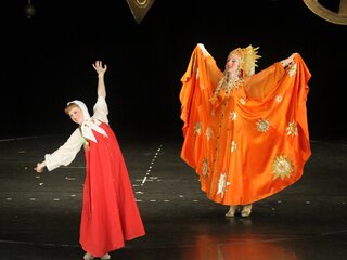 Баба-Яга со своей верной избушкой совсем и не страшные: на одной симпатичное фиолетовое платьице, украшенное мухоморчиком, на другой — яркие осенние листочки, подсолнухи да зеленая лягушечка сбоку. А что до гусей-лебедей (в шикарных, кстати, косоворотках), так они просто скучающие лоботрясы, и большинству мальчишек в зале их хулиганские выходки очень даже понятны. Здесь нет вопиюще злых героев, есть те, кто обделены простыми человеческими чувствами: заботой, вниманием, любовью. Нет и приторно положительных — есть те, кто ошибаются и на ошибках своих учатся. А вместе с героями сказки и маленькие зрители учатся добру, чуткости, сердечному отношению к близким людям.