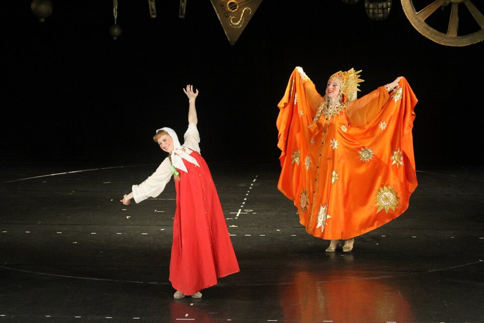 Баба-Яга со своей верной избушкой совсем и не страшные: на одной симпатичное фиолетовое платьице, украшенное мухоморчиком, на другой — яркие осенние листочки, подсолнухи да зеленая лягушечка сбоку. А что до гусей-лебедей (в шикарных, кстати, косоворотках), так они просто скучающие лоботрясы, и большинству мальчишек в зале их хулиганские выходки очень даже понятны. Здесь нет вопиюще злых героев, есть те, кто обделены простыми человеческими чувствами: заботой, вниманием, любовью. Нет и приторно положительных — есть те, кто ошибаются и на ошибках своих учатся. А вместе с героями сказки и маленькие зрители учатся добру, чуткости, сердечному отношению к близким людям.