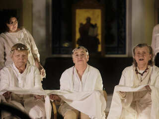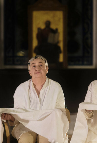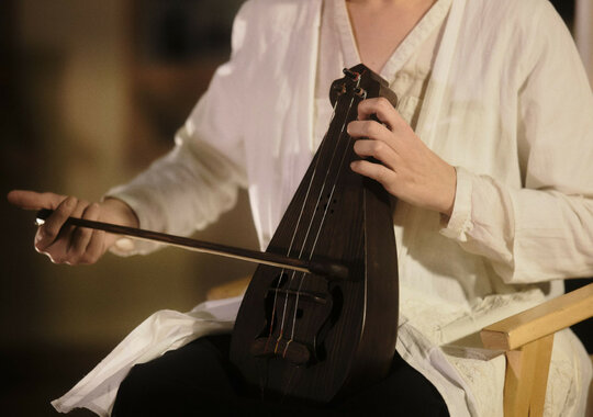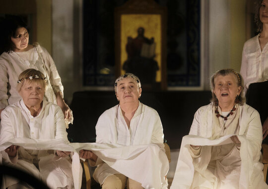 Музыкальный мир спектакля населяют звуки подлинных народных инструментов — деревянных трещоток, свистулек, гудка, рожка. А ткань рассказываемых сказок будто расшита мерным звучанием настоящей старинной прялки с псковской земли — её «голос» и начинает спектакль, сразу погружая зрителей в атмосферу домашнего тепла, уюта и покоя. В спектакле участвуют выпускницы петербургского «Инклюзиона», уже имеющие опыт участия в спектаклях «Ночи Холстомера», «Ли Бо» и «Маршруты», который три года шёл на Новой сцене Александринского театра.