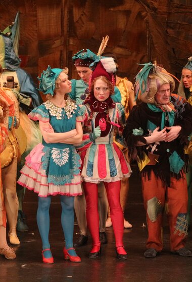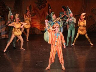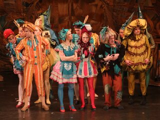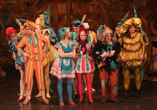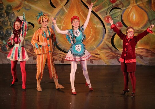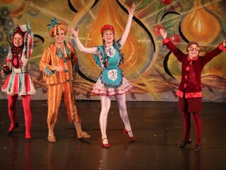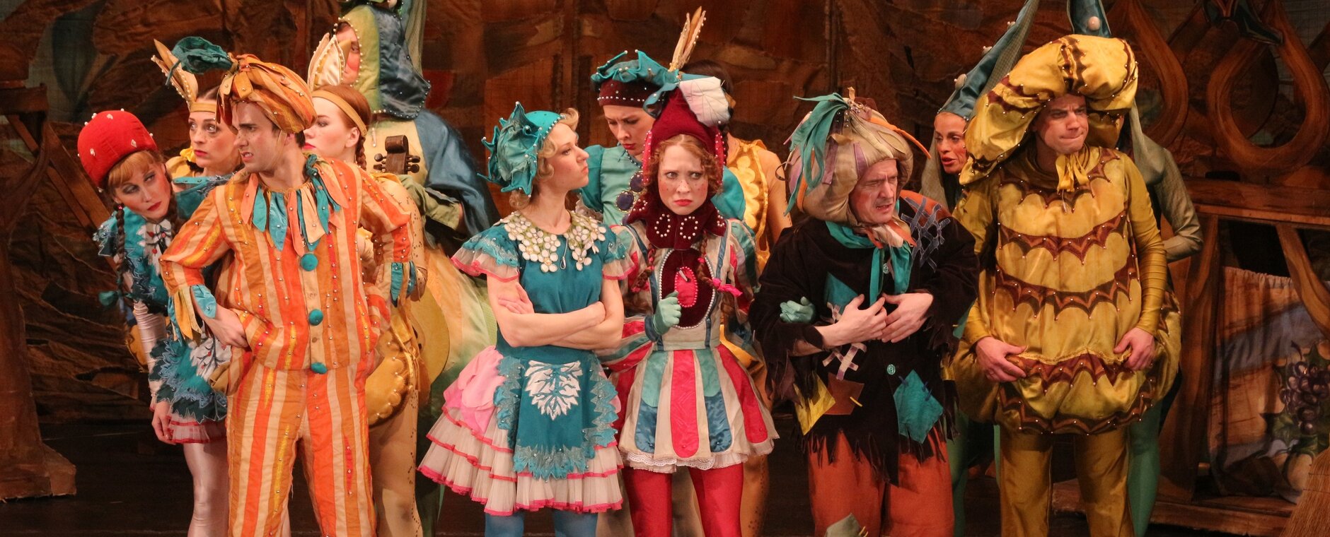 В спектакле «Чиполлино» детского драматического театра «На Неве» — именно такой. Перед началом на сцене живописное полотно: аппетитные фрукты и овощи, а в центре, как солнце, — светящаяся золотая луковица. Но вот спектакль начался, и перед нами уже бойкие человечки — персонажи известной сказки Дж. Родари. Отважный мальчик-луковка и его друзья живут своей насыщенной жизнью под жарким итальянским солнцем: они усердно трудятся и с удовольствием отдыхают (даже в театр ходят!), а когда случается горе, подбадривают друг друга веселой песенкой. Со стороны все это выглядит, как настоящий праздник красок: желтые Груша и Тыква; зеленые Виноградинка и Редиска; бордовый граф Вишенка… Даже «плохие» герои, красный Помидор и оранжевый Апельсин — к месту, ведь без них эта чудесная картина была бы неполной.