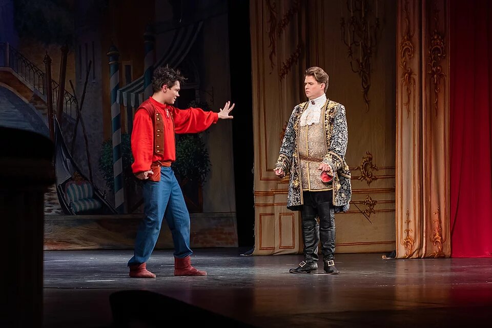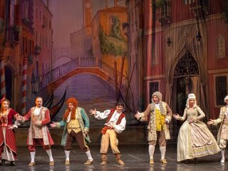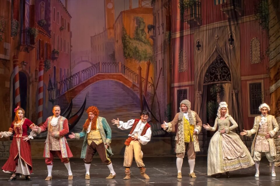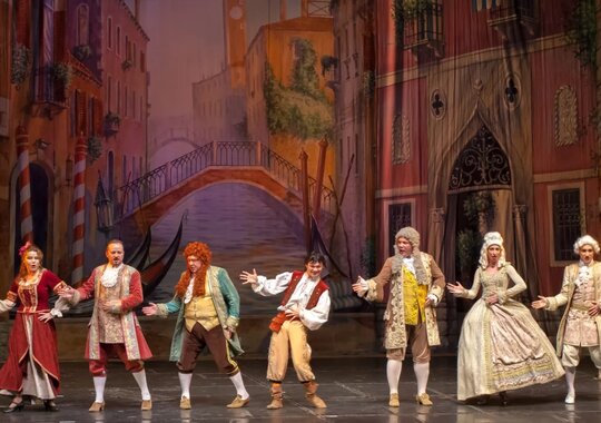 История веселого плута и пройдохи, который служит одновременно двум господам. Прекрасные и знакомые с детства мелодии А. Колкера перенесут вас на время в Венецию — город влюбленных, город карнавалов.