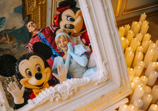 Переступив порог, вы сразу окажетесь в мире чудес: вас встретят Микки и Минни Маус в окружении других любимых персонажей! Парадная лестница превратится в волшебный зимний лес, который станет идеальным фоном для фотографий.
