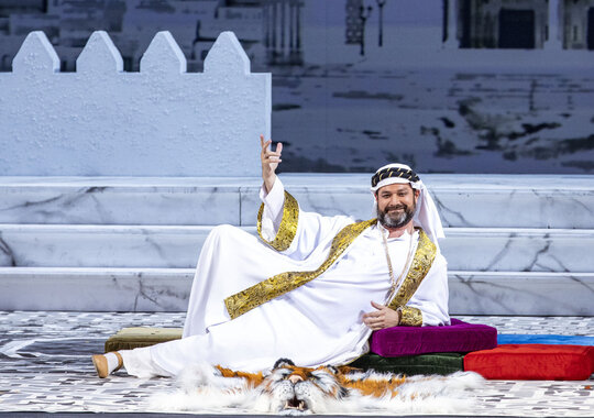 Не менее щедр Россини и в отношении других солистов: для баса cantante, подвижного и певучего, он написал труднейшую партию одураченного бея Мустафы, для тенора di grazia — роскошную, полную высоких нот партию Линдоро, с чудесной выходной арией Languir per una bella, предваряемой элегичным соло валторны. У прочих героев тоже есть эффектные номера, но когда они собираются в ансамбли, партитура начинает искрить так, что дух захватывает, особенно в знаменитом финале первого акта — с его звукоподражательной чехардой «динь-динь! бум! бах-бах! кар-кар!»: воистину, как говорил Стендаль, организованное совершенное безумие!