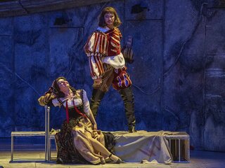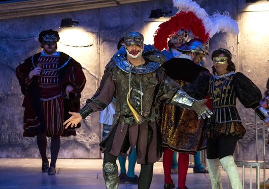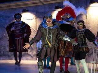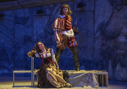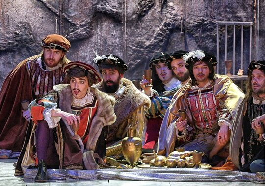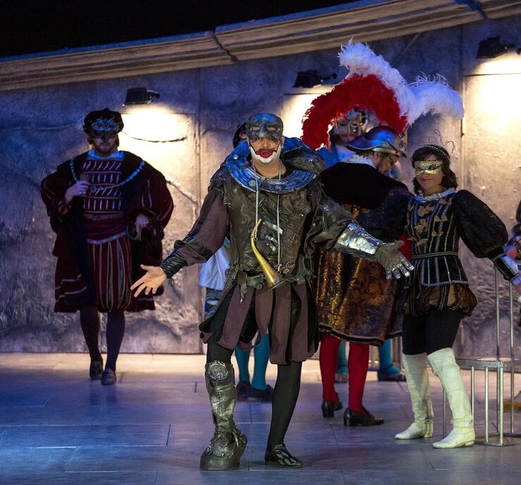 Роскошные, изысканные костюмы словно погружают зрителя в историческую атмосферу. Кажется, что персонажи спектакля, облачённые в дорогие ткани и прихотливые маски, словно сошли с полотен старых мастеров. Спектакль очень цельный, с продуманными до мелочей деталями, да и просто красивый. А актёрская игра и превосходное музыкальное исполнение отвечают замыслу самого композитора — создателя жанра музыкальной драмы.