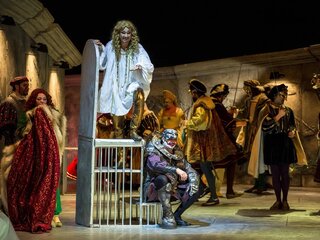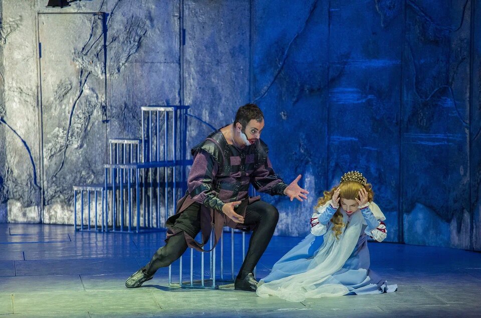 Режиссёр предложил публике новую версию психологической драмы, по которой придворный шут вовсе не горбун, а язвительный, умный, злой и совсем не старый человек. Горб и маска — всего лишь шутовское обличье, которое он надевает только при дворе герцога. Однако нравственное уродство нельзя скинуть, как маску. Неординарный человек, вынужденный терпеть постоянное унижение, он развлекается интригами, охотно принимает участие в грязных забавах своего господина и его окружения. Судьба наказывает Риголетто за жестокость, превращая в убийцу собственной дочери Джильды.