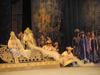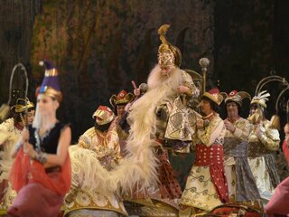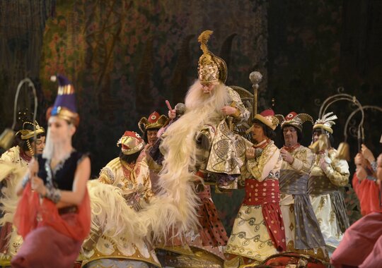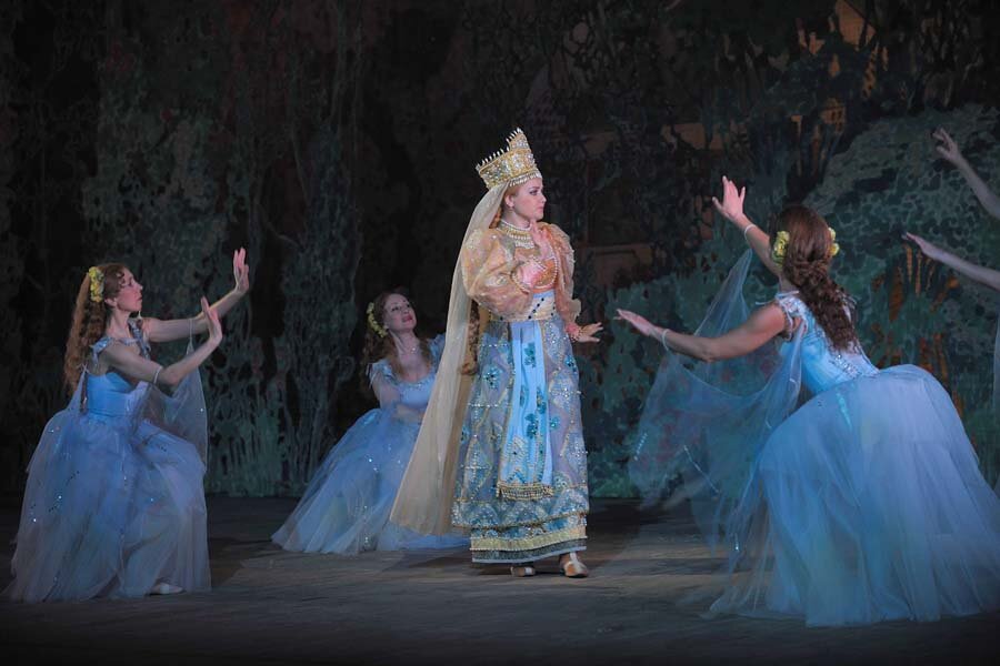 Слова Одоевского о «Руслане и Людмиле» можно отнести и к постановке этой оперы в Мариинском театре. Бельгиец Тьерри Боске месяцами работал в художественных мастерских театра, лично искал ткани для костюмов в магазинах по всему миру, стремясь спустя девяносто лет воспроизвести умопомрачительные краски и орнаменты легендарного спектакля 1904 года. Тогда, в год столетнего юбилея Глинки, над оформлением «Руслана» работали Константин Коровин и Александр Головин. Пышный русско-византийский модерн их сценографии поражает и сегодня, как в целом, так и в деталях, рассматривать которые — отдельное удовольствие. Картины оперы сменяют друг друга, словно страницы гигантской иллюстрированной книги сказок. Отдельного упоминания заслуживают танцы; они воскрешают другой юбилейный спектакль, 1917 года, когда в Мариинском театре праздновали 75-летие со дня первого представления «Руслана и Людмилы». Он шёл в знакомых декорациях, но с новыми танцами Михаила Фокина. Ускользнувший от либреттистов пушкинский юмор вернулся в поставленных Фокиным танцах и шествиях, особенно — в кульминационном Марше Черномора.