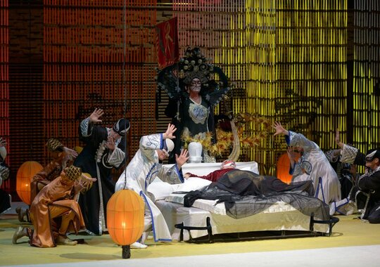 Слуги украшают дворец праздничными фонариками. Кухарочка рассказывает всем о Соловье: он маленький и невзрачный, но от его пения на глаза наворачиваются слёзы. Появляется торжественная процессия, слуги вносят сидящего под балдахином повелителя Поднебесной. Соловей поёт, и его прекрасные трели очаровывают Императора. Он хочет наградить певца золотой туфлей, но тот отказывается: лучшая награда для него — слёзы на глазах слушателей.