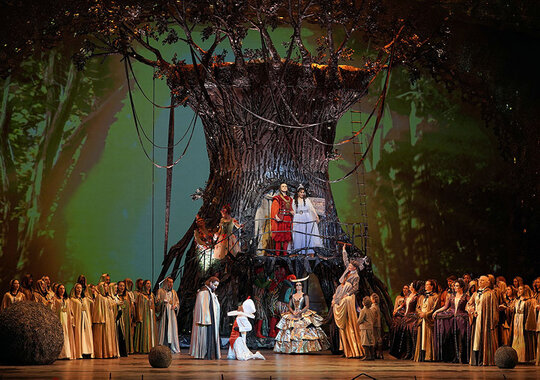 Одну из самых популярных опер Моцарта зрители Мариинского театра много лет слушали в Концертном зале на русском языке. В новом спектакле музыкальная часть прозвучит на языке оригинала, а диалоги — на русском. Поэтому готовиться к премьере артисты начали с необычных для музыкального театра застольных репетиций и разучивания диалогов, которые вокалистам нужно будет отыгрывать на сцене как драматическим актёрам.
