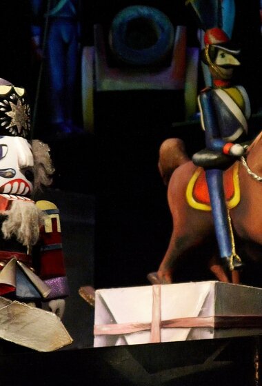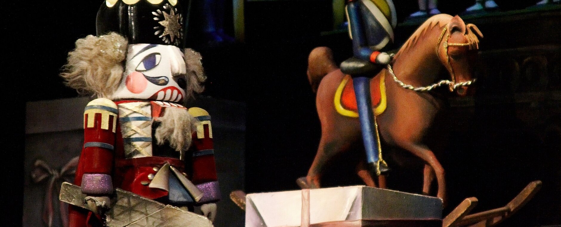 В одном сценическом пространстве существуют ночной город с рождественскими елочками в горящих окнах и крошечная гостиная в доме Штальбаумов, в которой танцуют нарядные гости; та же гостиная, но странно изменившаяся и ставшая в десятки раз больше; детская комната, которая становится ареной военных действий с батальными сценами и войском игрушек, до поры до времени стоявших в шкафу; Марципановое королевство с дворцом принцессы Пирлипат, а также таинственный Автор, который становится то маленьким, то большим, то и вовсе крошечным.