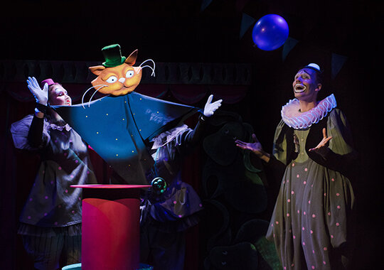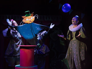 Вот шпрехшталмейстер выглядывает из-за кулис, а его голова, будто в мультфильме, уплывает вниз. А кто же там над сценой в воздухе завис? Это настоящий кот-иллюзионист!