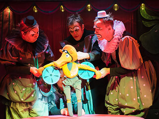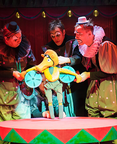 Дамы и господа! Взрослые и дети! Спешите увидеть диковинное шоу, где клоуны и куклы попадают в единый аттракцион! Вас ожидают лучшие цирковые артисты: комарики-акробаты, жаба-эквилибристка, бирюзовые медведи верхом на велосипеде. Вслед за ними — грустный мим, он очарователен и мил.