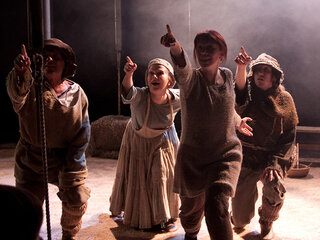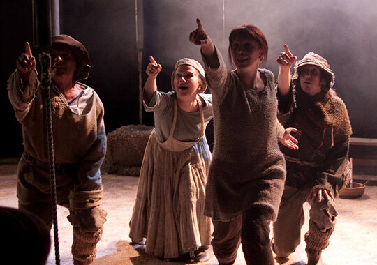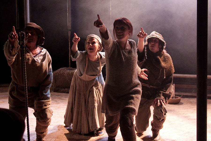Но сложные философские размышления, присущие автору пьесы, не делают спектакль тяжеловесным, напротив – стихия игры, азарта, юмора захватывает всех героев драмы. История о деревенской девчонке, ведомой божественными голосами, которые направляют её на тяжкий путь испытаний и битв за освобождения Франции, рассказывается создателями спектакля с изрядной долей иронии.