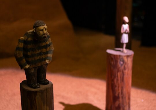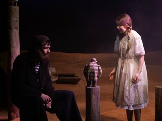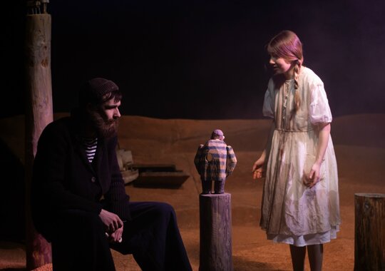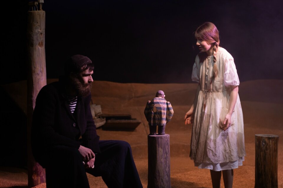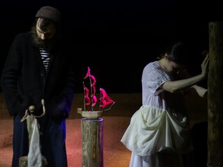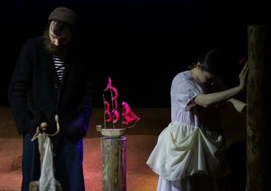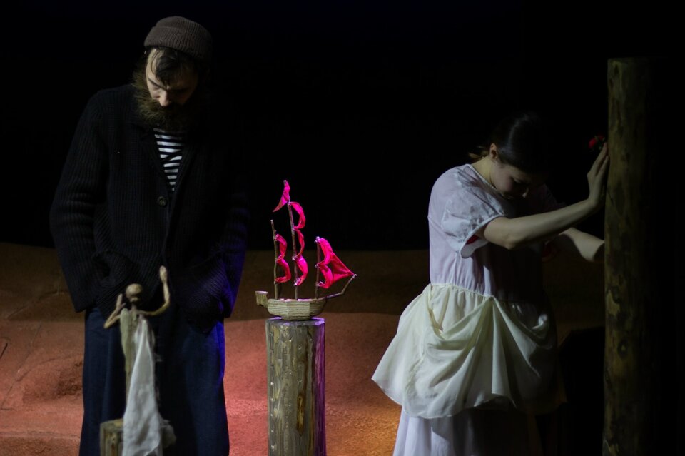 Что объединяет утрату, стремление и веру? Одно слово: любовь. И цвет у нее совершенно чистый, алый, полный благородного веселья и царственности. Именно тот алый, без смешанных оттенков огня, лепестков мака, игры фиолетовых или лиловых намеков; ни синевы, ни тени — ничего, что вызывает сомнение. Когда человек жаждет чуда — сделай ему это чудо. Режиссер спектакля Екатерина Ложкина-Белевич: «Мне захотелось сделать эту историю про тот самый алый оттенок, о котором писал автор — ярко-красные, цвета жизни и молодой крови паруса. И в том числе цвета революции — революции молодой жизни. В спектакле я оставляю четырех героев и подчеркиваю конфликт отцов и детей, который всегда актуален. Я всегда за то, чтобы театр был для всех, и для меня важно, чтобы в зале оказался не только подросток, но и родитель, который должен увидеть произведение со своей стороны и защитить или опровергнуть, согласиться или не согласиться — тогда будет что вместе обсудить. Поэтому здесь остаются отцы и дети. У старшего поколения есть свой опыт. Но есть новые, молодые люди, которые, как мне кажется, совершенно другие, и навязывать им свое, взрослое, восприятие не вполне правильно. И хочется довериться этим новым людям и поверить в то, что у них может быть по-другому, иное счастье, в которое стоит включиться, отпустив свой бэкграунд, — вот за это хочется посражаться. И ещё одна важная, возможно, основная вещь у Грина — о том, что мы все можем „вытащить себя за волосы“ из любой ситуации, даже когда это кажется невозможным. Сделать это своими руками. Только нужно хотеть этого „чуда“. Жаждать его. Прислушиваться». В спектакле используется фрагмент стихотворения И. А. Бродского «С видом на море». Спектакль идёт без антракта.