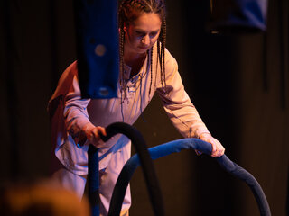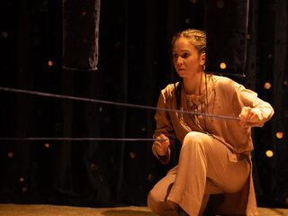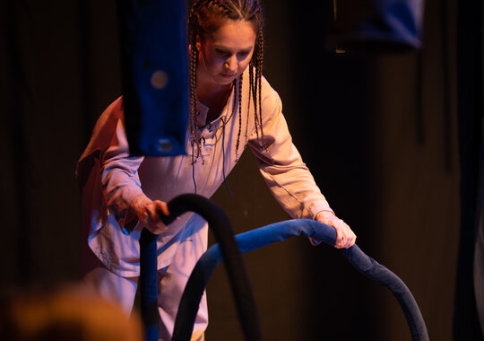 Спектакль строится на ассоциативных образах и тактильно-чувственном восприятии пространства, в котором складываются микро- и макро-вселенные, собранные из объектов разных цветов, размеров, фактур и звучания (визуальная история сопровождается живой музыкой).