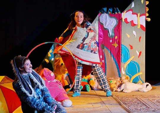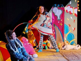 Границы между сценой и залом, между артистами и детьми в спектакле почти нет: дети сидят на разноцветных подушках, но могут подойти к сцене — и здесь танцевать, петь, прятаться от воображаемого дождя под зонтом. А главное — дети могут помочь девочке, главной героине спектакля, найти потерявшуюся куклу.