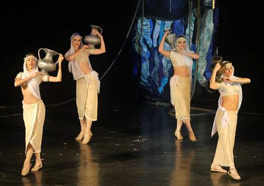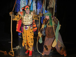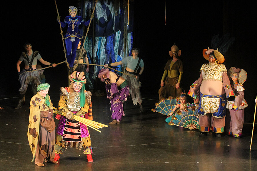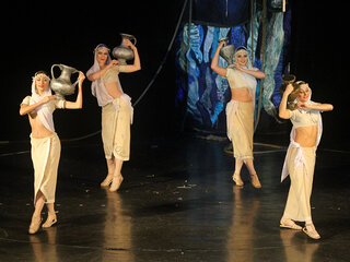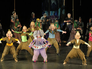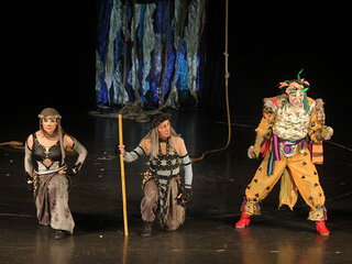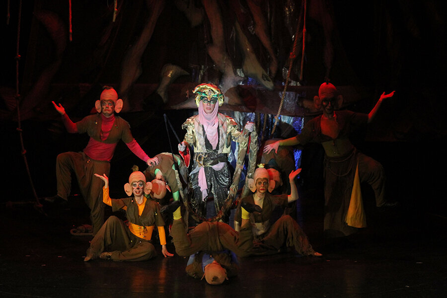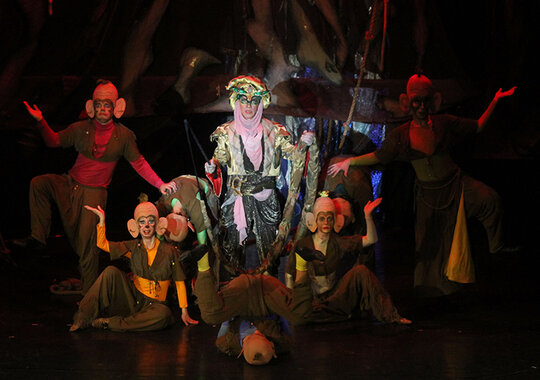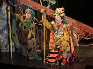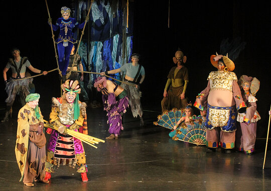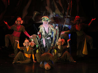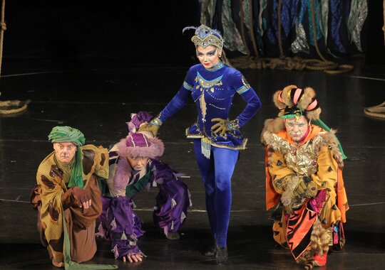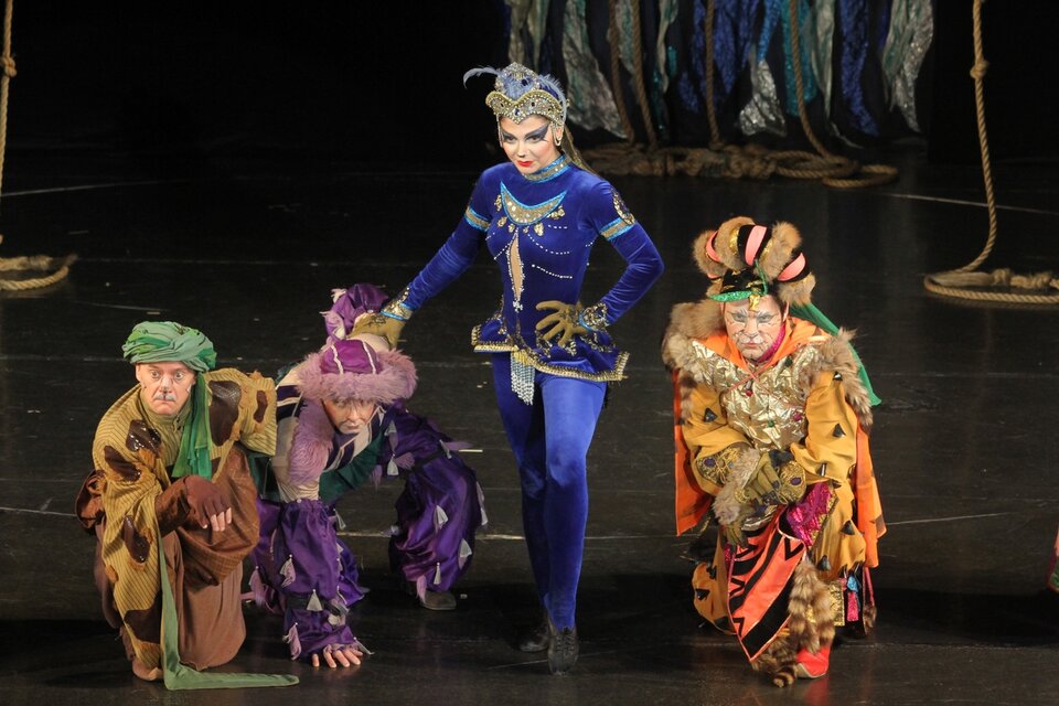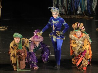 Не просто в сказочные джунгли приглашает вас театр «На Неве», а в восточную страну с ее экзотическим колоритом. Здесь у грозного Шерхана — роскошное военное платье и тюрбан, а его слуга Табаки облачен в отрепья бедуина. На шакалах коричневые шелка, лица их скрывает зеленая чадра, а каждый шаг сопровождается звоном монист. Слон Хатхи выступает, как вальяжный пузатый раджа, а танцующие со своими дивными хвостами-веерами павлины — завораживают.