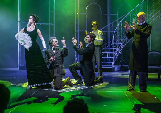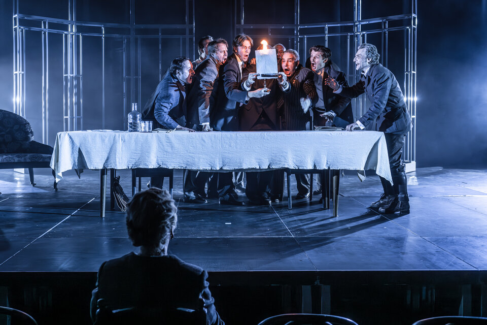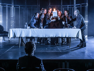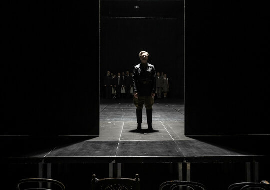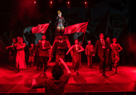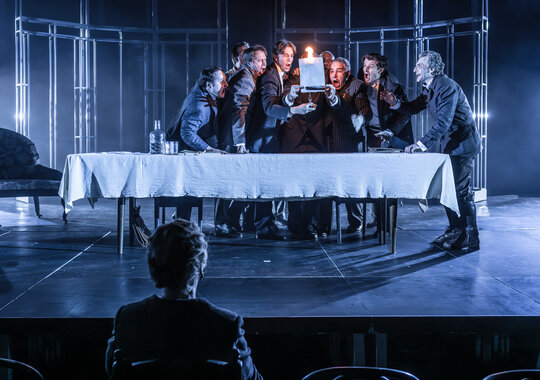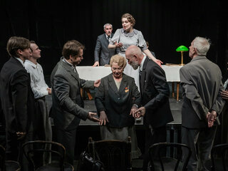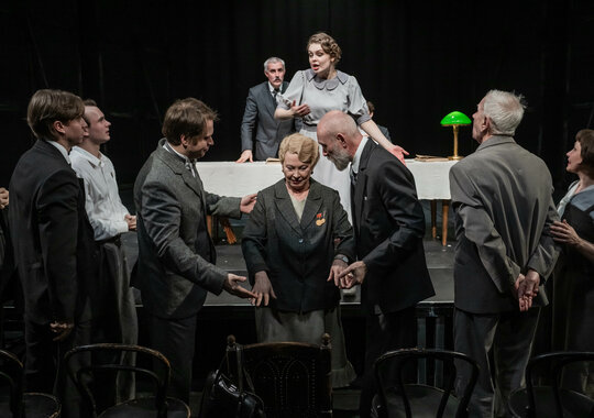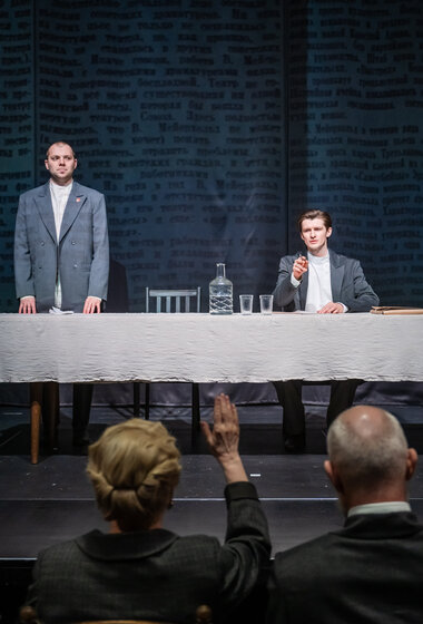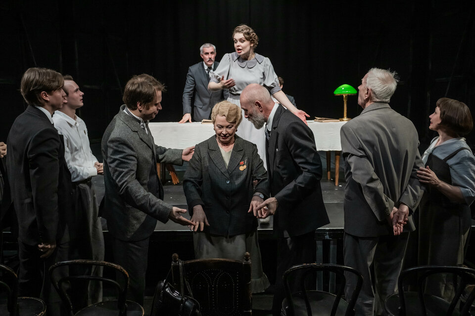 Реальные диалоги почти вековой давности, казалось бы, должны погрузить нас в театр документальный, свидетельский. Но в плотную ткань бытового, острохарактерного театра, Валерием Фокиным мастерски вплетены сцены воспоминаний, фантазий самого Мейерхольда. Благодаря этому конфликт перестаёт быть бытовым, но поднимается до обобщений, затрагивая извечные вопросы: взаимоотношения художника и общества, возможности компромисса между творческой необходимостью и человеческой справедливостью, меры ответственности художника перед самим собой и перед теми, кто пошёл за ним…