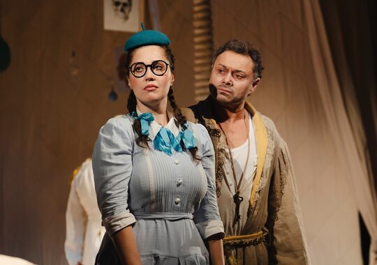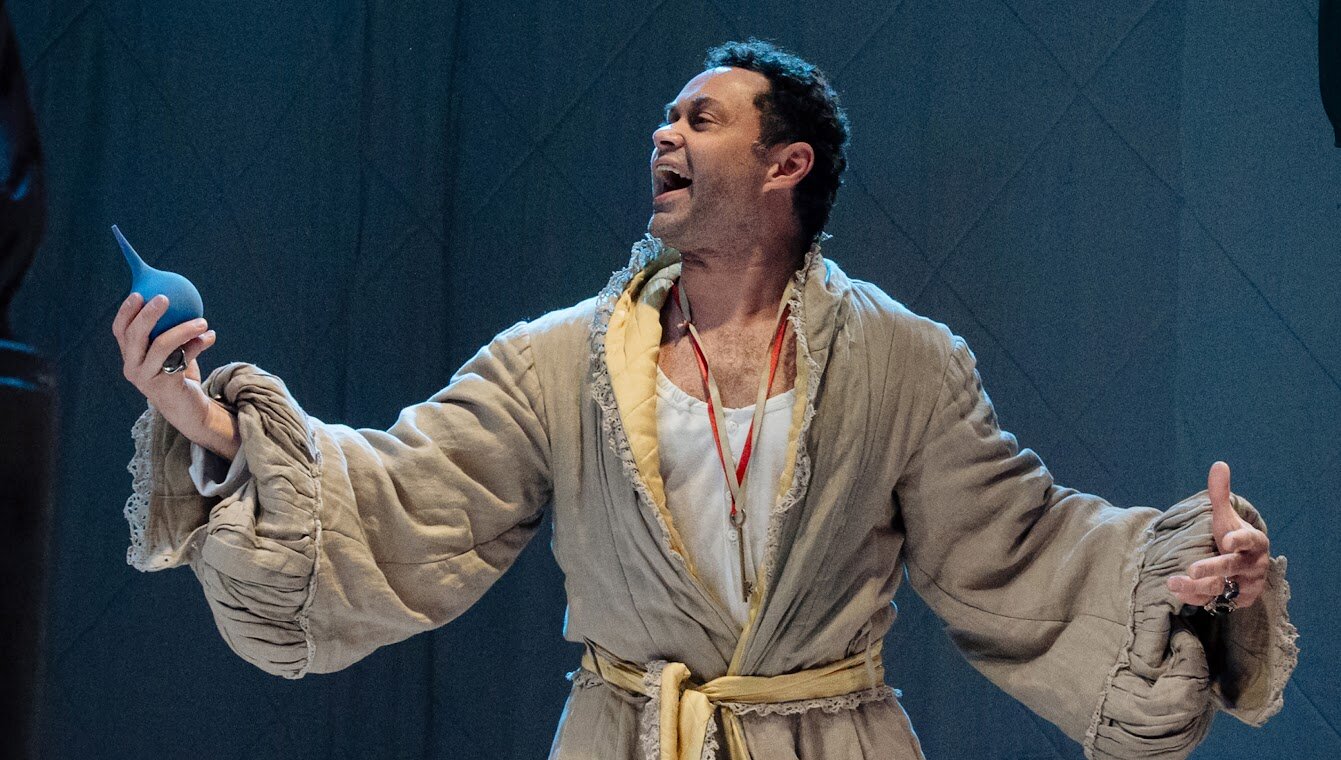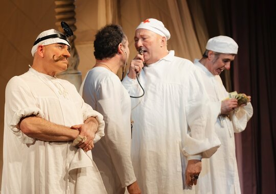 Отточенные реплики, игра смыслами и словами — эпохи смешиваются, аллюзии неожиданно становятся очевидными. Роль мнимого больного разыгрывается так, что веришь в искреннее убеждение героя: мир можно заставить вращаться вокруг себя. А вот можно ли заставить окружающих тебя любить? Наивность не прощается — мошенники от медицины, аптекари, священники и прочий ушлый люд тут как тут.