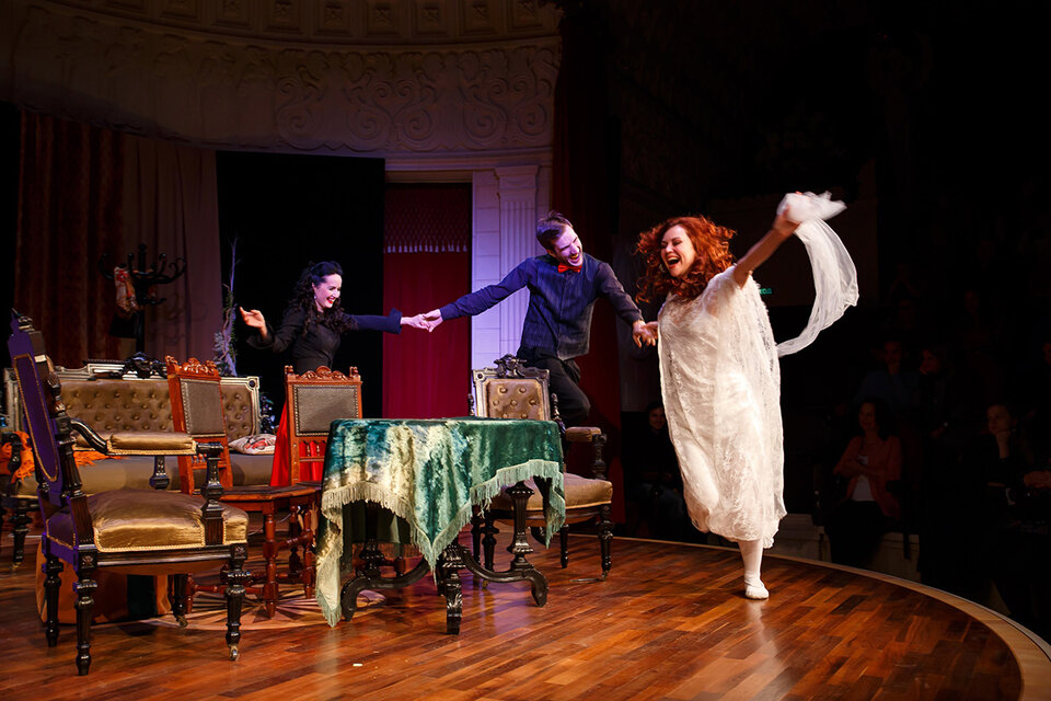 Места в театре располагаются за столиками. Можно сделать заказ по меню авторской кухни и барной карте.