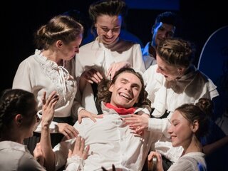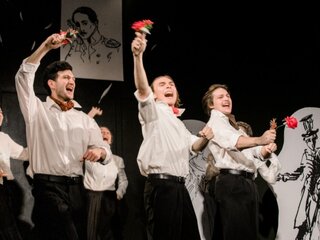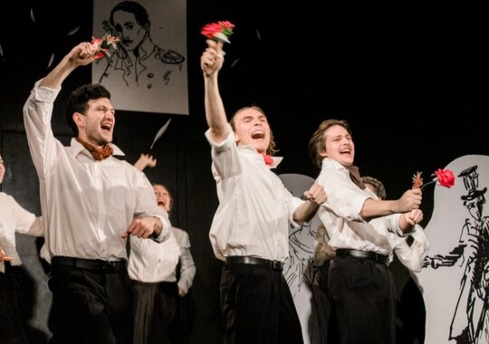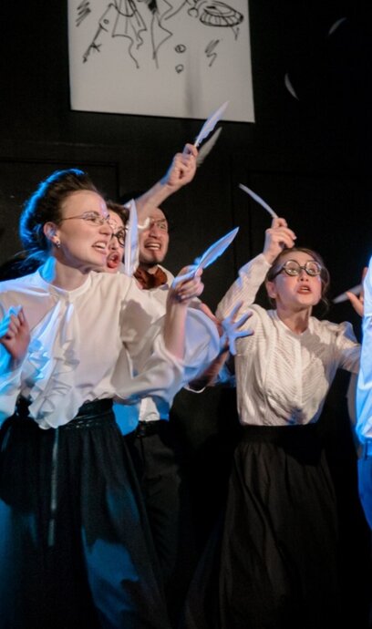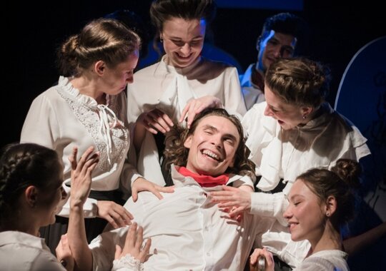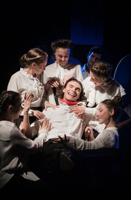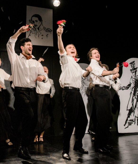 По поэме М. Ю. Лермонтова «Тамбовская казначейша». Поэтический анекдот. В основу поэмы положен реальный случай, произошедший, однако, не в Тамбове, а в Москве примерно в 1800-м году: князь Александр Голицын проиграл в карты графу Льву Разумовскому свою жену Марию Григорьевну, в девичестве Вяземскую. В поэме же М. Ю. Лермонтов настолько точно воссоздал образы провинциального городка и его обитателей, что это позволило его современнику Н. В. Гоголю увидеть в молодом поэте будущего «великого живописца русского быта». Так вот что происходит в этом анекдоте: однажды в маленький городок входит военный полк. Ходят слухи, что солдаты останутся в городе на зиму, а это отличная возможность девицам выйти замуж. По этому случаю народ гудит, устраиваются приёмы и балы. Роман, ревность, попытка отомстить и трагический проигрыш городского казначея в карты улану и своего состояния, и даже своей жены. Примечательно, что Лермонтов пишет эту не самую известную поэму Онегинским стихом. Связь между творчеством Пушкина и Лермонтова с самого начала ощущалась если не всеми, то во всяком случае наиболее проницательными из критиков Лермонтова. И отчасти это стало и упреком «в плагиате», и восхищёнными возгласами о появившемся преемнике великого поэта. Спектакль лёгкий, как глоток шампанского на балу, однако имеющий лермонтовский холодок сарказма и тонкой грусти по полковой безбашенной юности. В составе исполнителей возможны изменения без дополнительного уведомления.