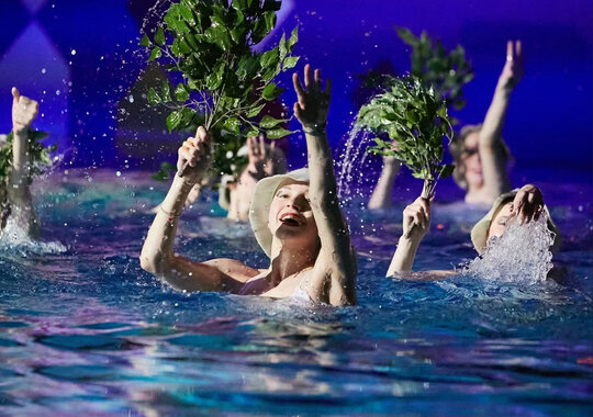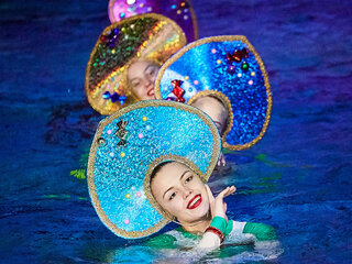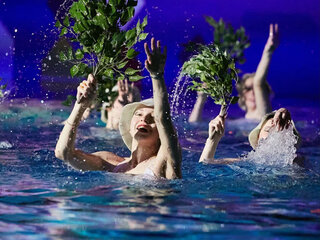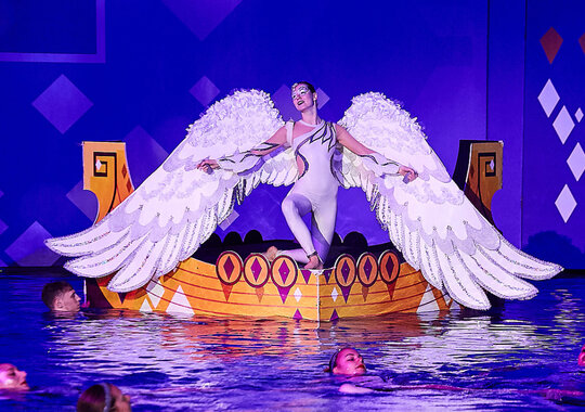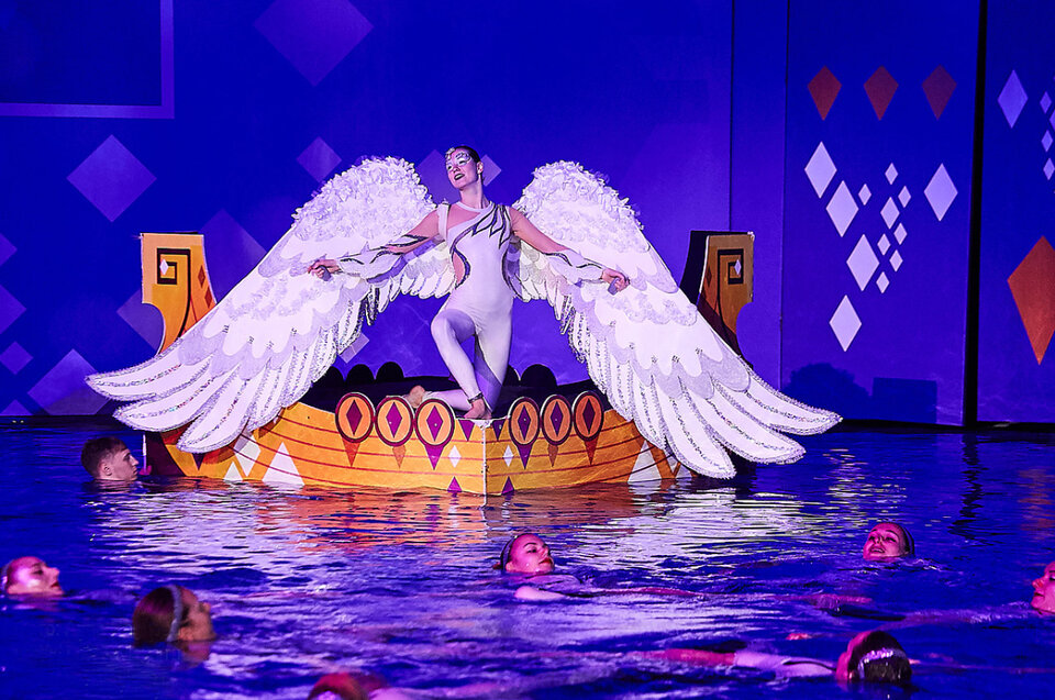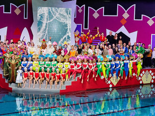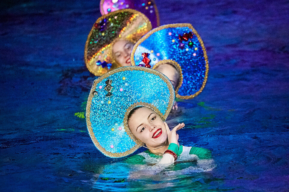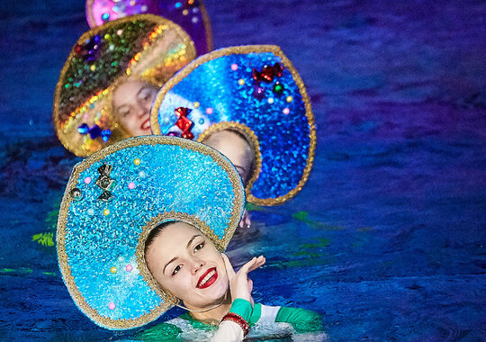 Звёзды мирового синхронного плавания, прыжков в воду, художественной гимнастики. Спортсмены – экстремалы на флайборде. Уникальные мастера трюковой акробатики, цирка, спортивной хореографии. Артисты кино и театра. Вся команда, без сомнения, делает волшебный спектакль на воде «Сказка о царе Салтане» одним из самых запоминающихся представлений для детей.