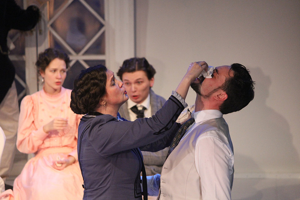 «Вишневый сад» – третий чеховский спектакль в репертуаре театра Льва Эренбурга, который продолжает исследование человеческих взаимоотношений на материале классики. Спектакль наглядно демонстрирует принцип работы театра-студии: в нем занято четыре поколения учеников Эренбурга, включая шестерых ребят, выпускников 2017 года, поступивших в труппу. Спектакль создан в фирменном для НДТ, смешанном трагикомическом жанре. У каждого в этой истории есть глубокая душевная травма, от которой каждый бежит, которую каждый прячет. Кажется, все почти благополучно и проблемы решаемы, но запутавшиеся в себе герои предпочитают действовать вопреки, будто испытывая терпение вселенной. Все взоры обращены на Раневскую (Ольга Альбанова) – мать, сестру, барыню, от встречи с которой каждый ждет волшебного избавления от своих трудностей… Но кто бы избавил ее от своих.