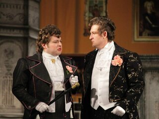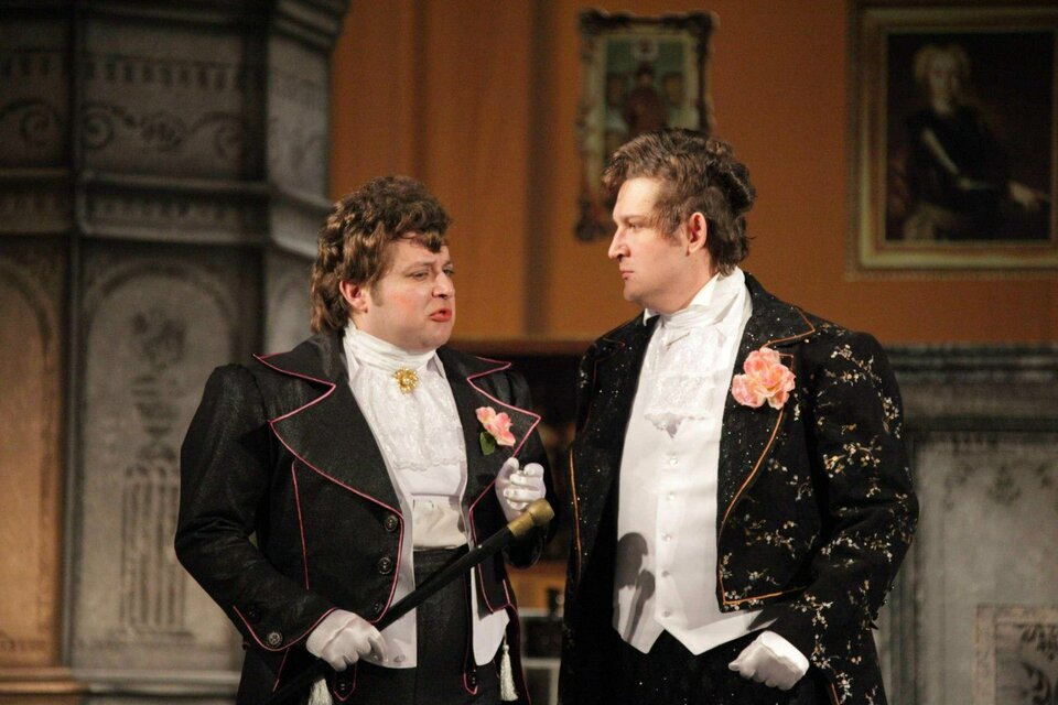 Современность спектаклю придает ритм речи, которая звучит как-то повседневно, нестихотворно, общий темп, интонации, паузы, кажется, вот-вот артисты перестанут валять дурака и, вздохнув, снимут с себя эти фраки, шейные платки, перчатки и останутся в своем настоящем, привычном одеянии — джинсах ли, футболках.
