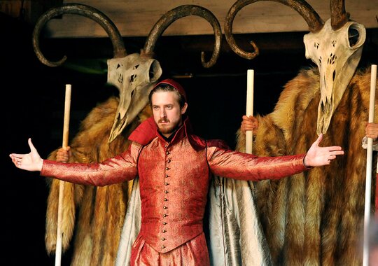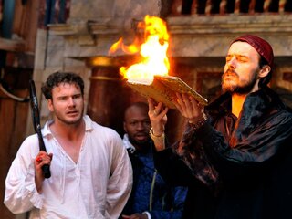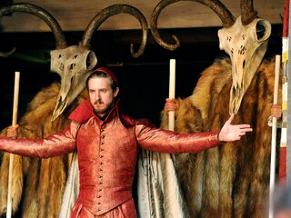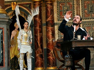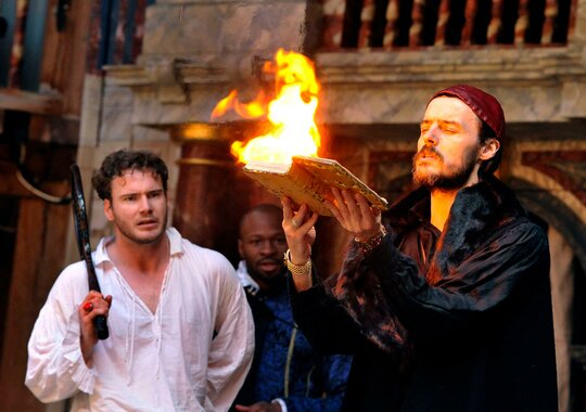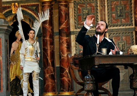 Данстеру это удаётся — он на полную запускает хитроумную театральную машинерию елизаветинского театра: оживающие книги, драконы, настоящее адское пламя, полыхающее на сцене, дым, устрашающие маски, черепа и прочие дьявольские спецэффекты, поражавшие воображение неискушённых зрителей партера во времена Шекспира и Марло, производят зловещее впечатление и сегодня.
