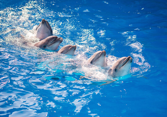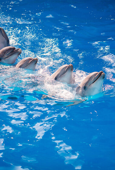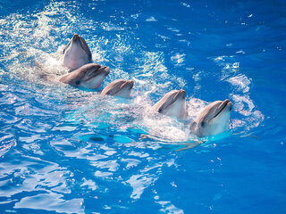 Это специально организованная программа, когда Вы не просто находитесь в воде рядом с дельфинами, а плаваете с ними. Вы опуститесь в воду, а дельфины подставят вам свой плавничок и провезут по кругу бассейна. Чувство счастья от знакомства и единения с морским миром будет одним из самых ярких в вашей жизни.